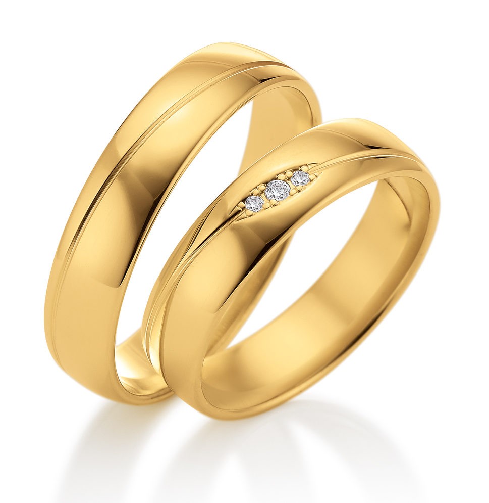 Paire d’alliances en or jaune 750 / 18 carats. La largeur de l’anneau est de 5.0 mm avec 3 diamants de 0.02 carat sur le modèle femme.