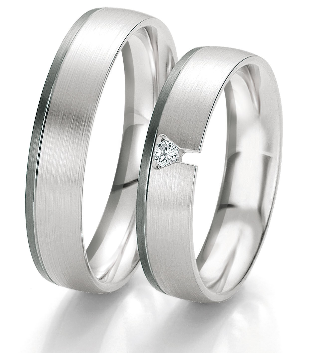 Paire d’alliances en or blanc et gris 585 / 14 carats ou 750 / 18 carats. La largeur de l’anneau est de 5.0 mm et diamant de 0.04 carat sur le modèle femme.