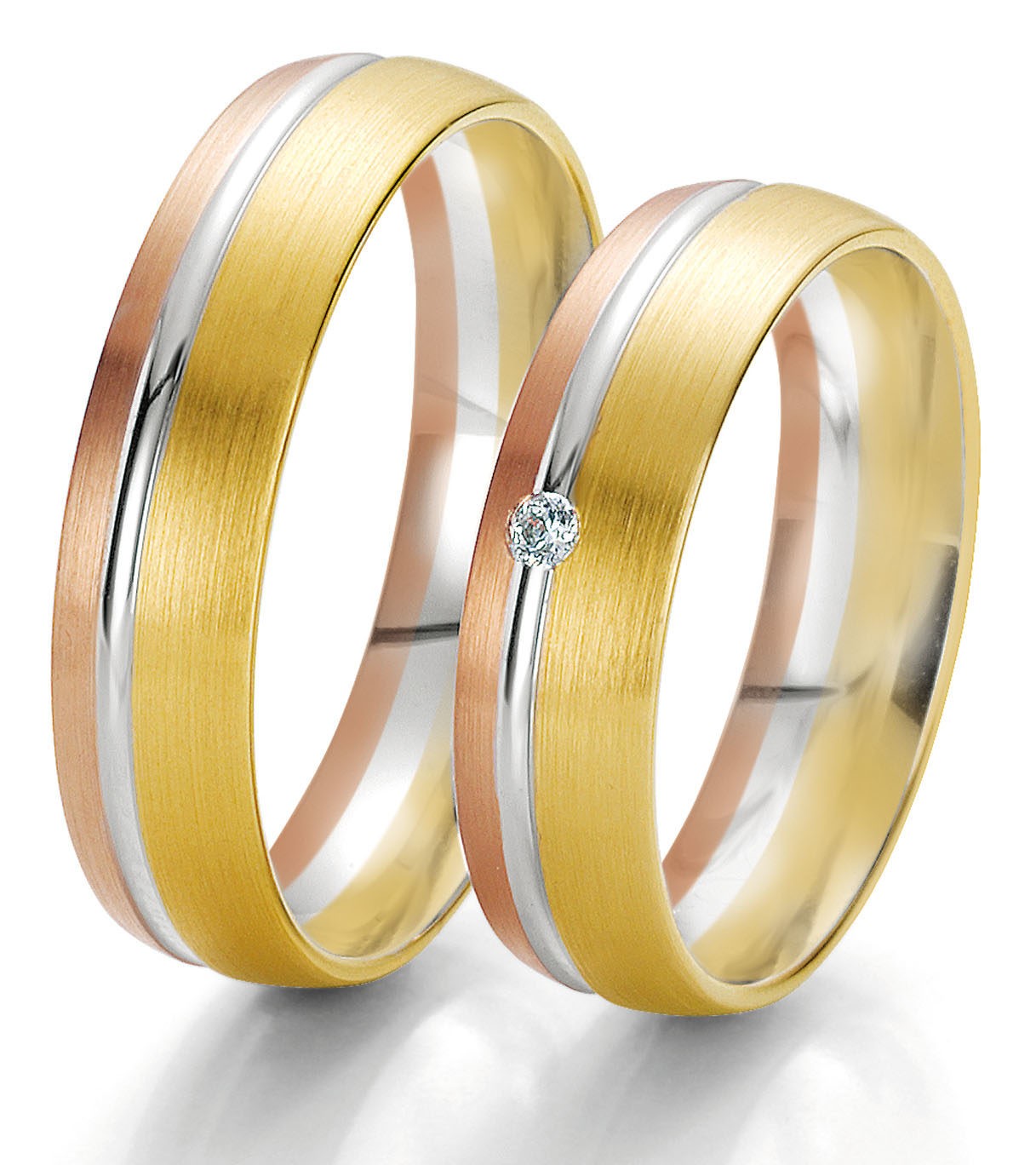 Paire d’alliances en or blanc et jaune et rose 585 / 14 carats ou 750 / 18 carats. La largeur de l’anneau est de 5.5 mm et diamant de 0.03 carat sur le modèle femme.