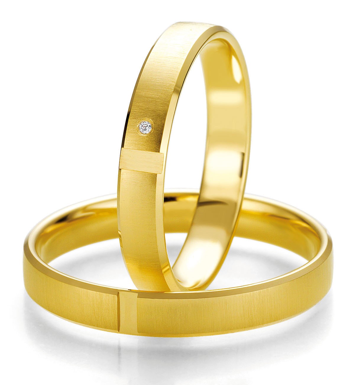 Paire d’alliances en or jaune 585 / 14 carats ou 750 / 18 carats. La largeur de l’anneau est de 3.5 mm et diamant de 0.017 carat sur le modèle femme.