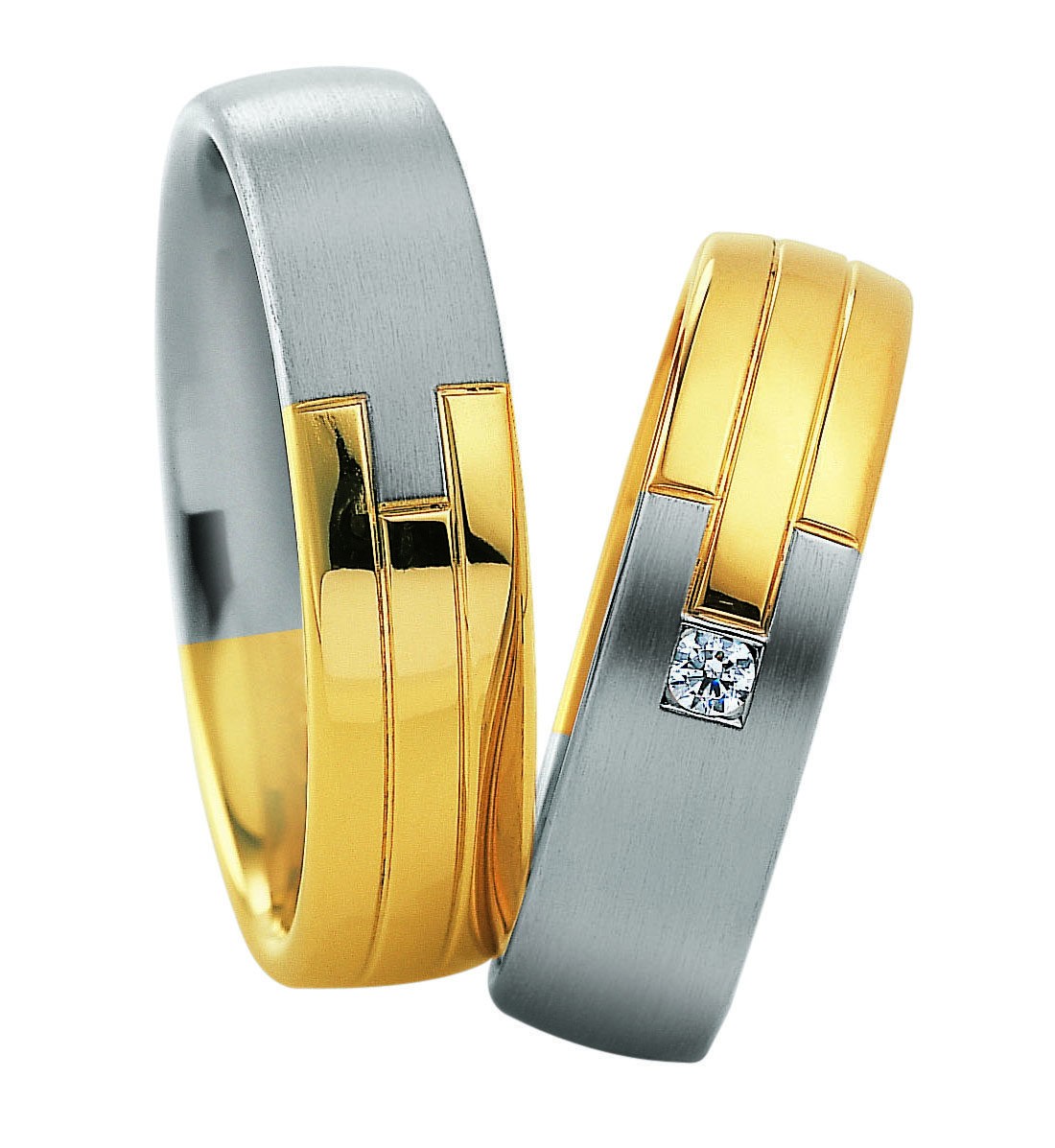 Paire d’alliances en or blanc et jaune 585 / 14 carats ou 750 / 18 carats. La largeur de l’anneau est de 6.0 mm et diamant de 0.045 carat sur le modèle femme.