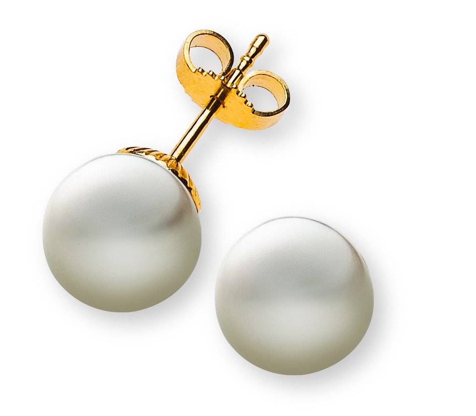 Clous d’oreilles Perles, or jaune 750, avec perles eau douce rondes, blanches, 8.5 - 9 mm