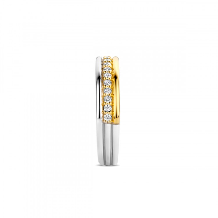 Cette bague en argent plaqué or TI SENTO 12282ZY comprend trois anneaux compilé en un. La bande centrale a une rangée de zircons. La bague est fabriquée en argent 925 et recouverte d’une épaisse couche de platinum et plaquée d’or . Portez cette pièce seule ou jouez en l’empilant avec d’autres bagues. Tous les bijoux TI SENTO sont emballés avec amour et une touche de magie.