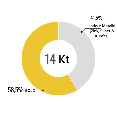14 Karat Gold oder 585er Gold besteht zu 58,5 % aus reinem Gold und zu 41,5 % aus Legierungen anderer Metalle wie Zink, Silber und Kupfer. Es ist billiger als 18 Karat.