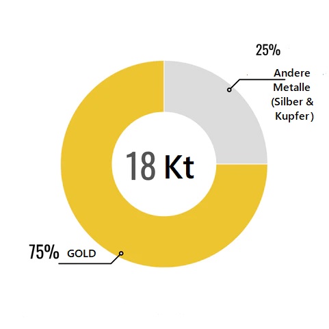 18-karätiges Gold oder 750er Gold besteht zu 75 % aus reinem Gold und zu 25 % aus anderen Metallen, die ihm seine Farbe verleihen und seine Festigkeit erhöhen. Es ist die am häufigsten verwendete Legierung in der traditionellen Schmuckherstellung. Je nach gewünschter Farbe werden andere Metalle wie Silber, Platin, Kupfer oder Palladium verwendet.