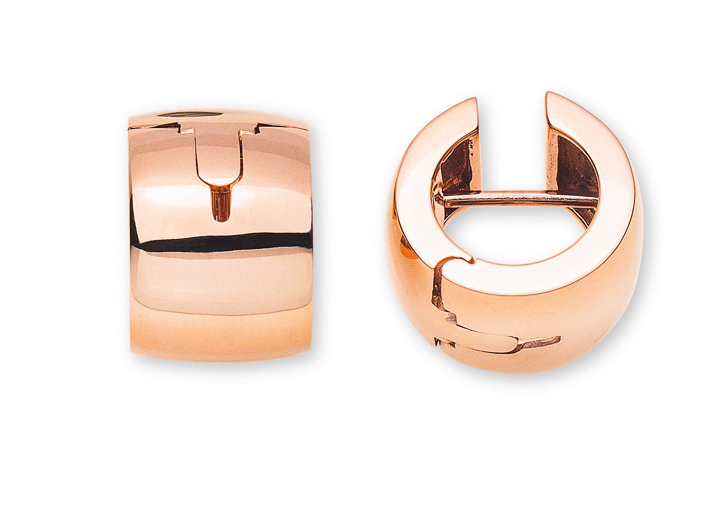 Creolen mit Scharnier, 750er Rotgold, handgefertigter breiter Teller, Durchmesser 16 mm, Breite 11 mm