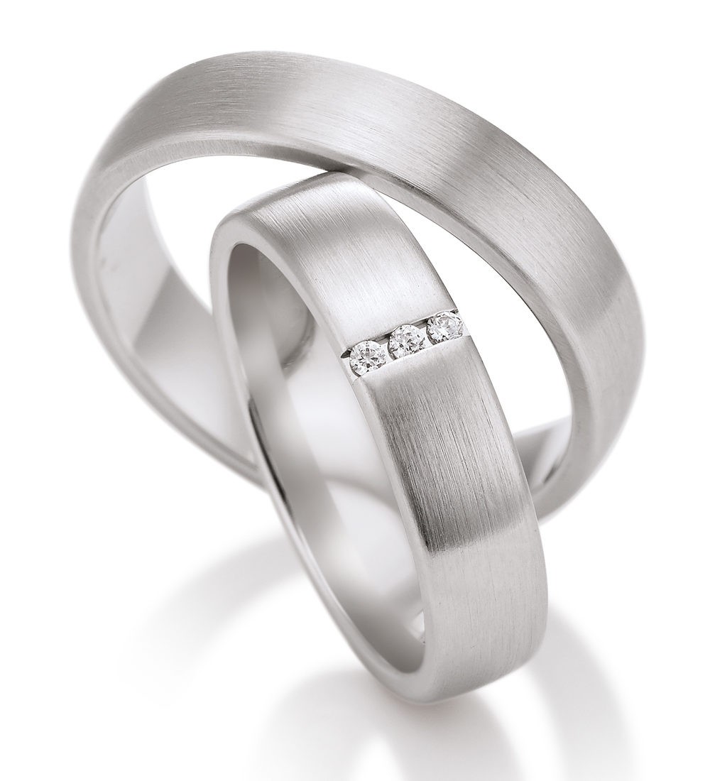 Paar Trauringe in Weißgold 750 / 18k. Die Breite des Ringes beträgt 5,0 mm mit 3 Diamanten von 0,03 Karat auf weibliches Modell.