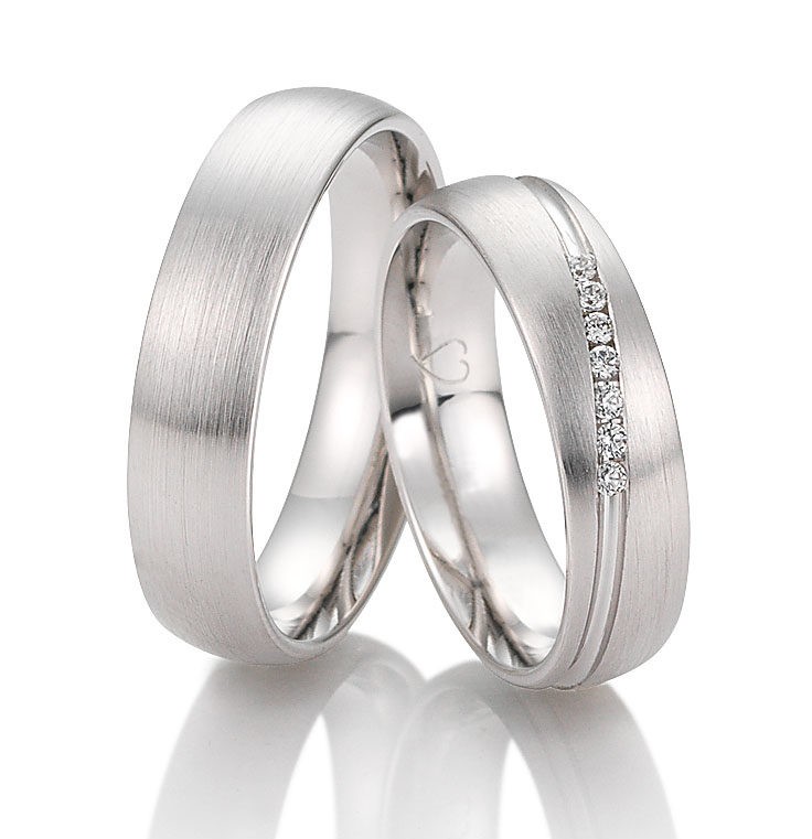 Weißgold Paar Trauringe 585/14 Karat oder 750/18 Karat. Die Breite des Ringes beträgt 5,5 mm und 0,084 Karat Diamanten auf...