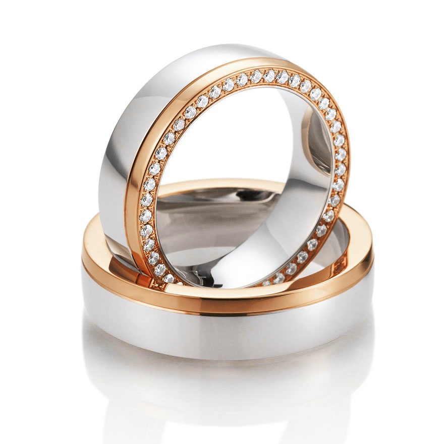 Paar Weißgold und rosa Trauringe 585/14 Karat oder 750/18 Karat. Die Breite des Ringes beträgt 6,0 mm und 0,338 Karat Diamanten auf dem weibliche Modell.