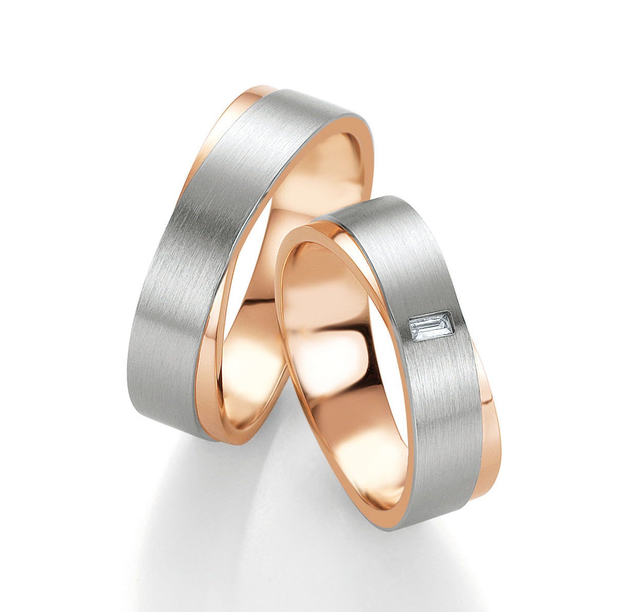 Paar Weißgold und rosa Trauringe 585/14 Karat oder 750/18 Karat. Die Breite des Ringes beträgt 7,0 mm und 0,06 Karat Diamanten auf dem weibliche Modell.
