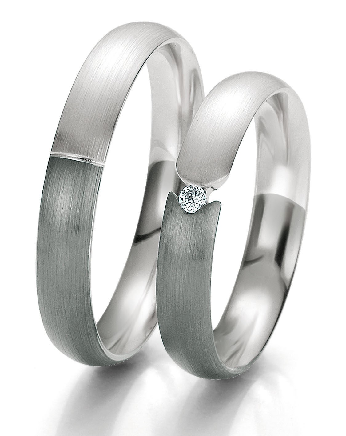 Ein Paar Weißgold und Grau Trauringe 750/18 Karat. Die Breite des Ringes beträgt 4,0 mm und 0,03 Karat Diamanten auf dem weibliche Modell.