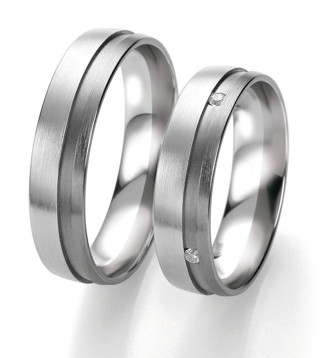 Ein Paar Weißgold und Grau Trauringe 585/14 Karat oder 750/18 Karat. Die Breite des Ringes beträgt 5,5 mm und 0,08 Karat Diamanten auf dem weibliche Modell.