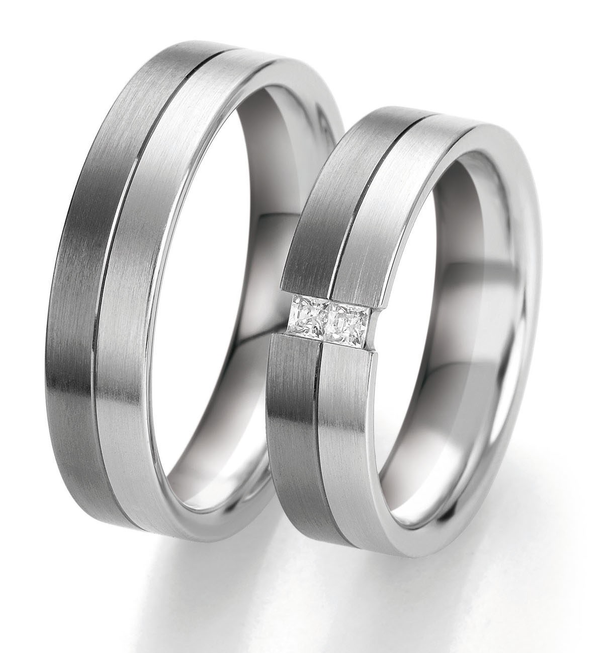 Ein Paar Weißgold und Grau Trauringe 585/14 Karat oder 750/18 Karat. Die Breite des Ringes beträgt 5,5 mm und 0,12 Karat Diamanten auf dem weibliche Modell.
