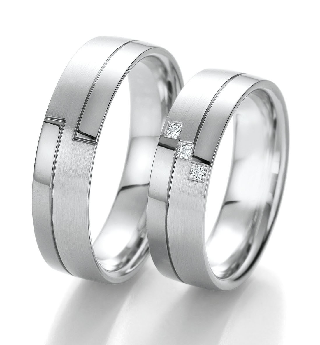 Ein Paar Weißgold und Grau Trauringe 585/14 Karat oder 750/18 Karat. Die Breite des Ringes beträgt 6,0 mm und 0,03 Karat Diamanten auf dem weibliche Modell.