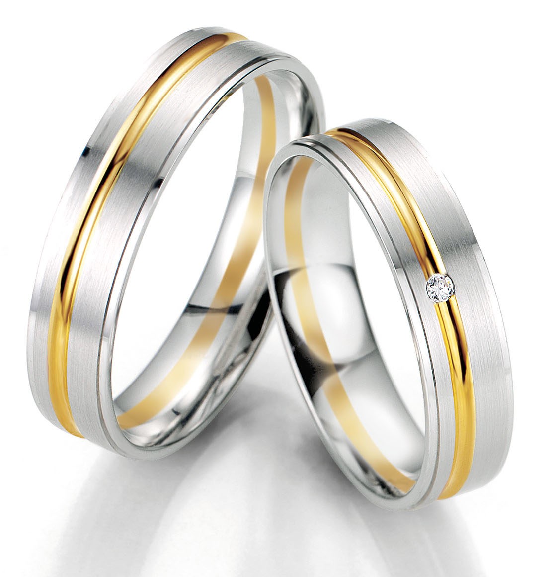 Ein Paar Weißgold und Gelb Trauringe 585/14 Karat oder 750/18 Karat. Die Breite des Ringes beträgt 5,0 mm und 0,015 Karat Diamanten auf dem weibliche Modell.
