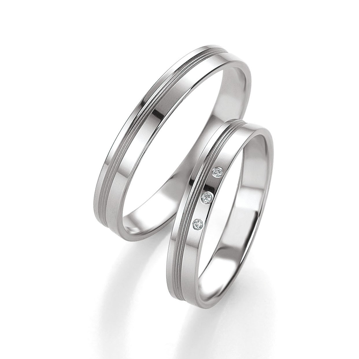 Trauringpaar aus Weißgold 585/14 kt. oder 750/18 kt. poliert / fein sandgestrahlt. Die Breite des Ringes beträgt 3,5 mm und 3 Diamanten von 0,017 ct. auf das Modell Frau.