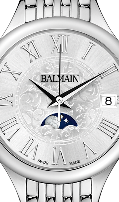 Balmain-Quarzuhr mit Mondphase, Balmain-Kollektion von Balmain, Gehäuse aus Stahl, silbernes Zifferblatt mit Arabesken, Saphirglas, Armband aus Stahl.