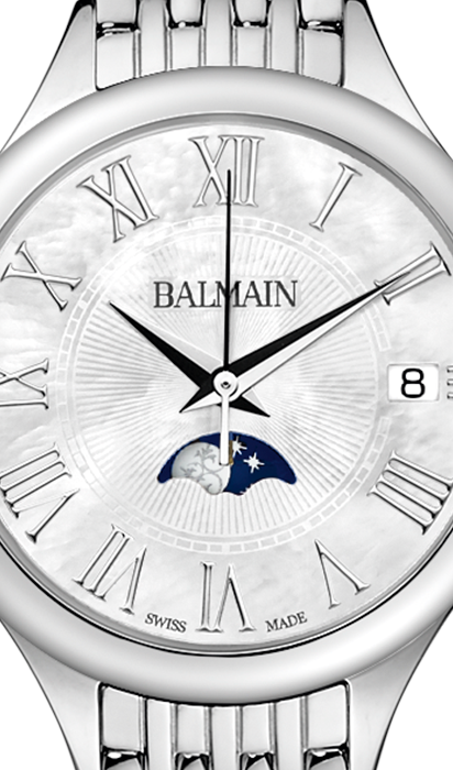 Balmain-Quarzuhr mit Mondphase, Balmain-Kollektion von Balmain, Gehäuse aus Stahl, Zifferblatt aus Perlmutt, Saphirglas, Armband aus Stahl.