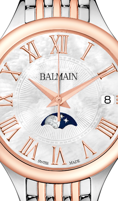 Balmain-Quarzuhr mit Mondphase, Balmain-Kollektion von Balmain, zweifarbiges Stahlgehäuse mit rosa PVD-Beschichtung, Perlmuttzifferblatt, Saphirglas, zweifarbiges Stahlarmband mit rosa PVD-Beschichtung.
