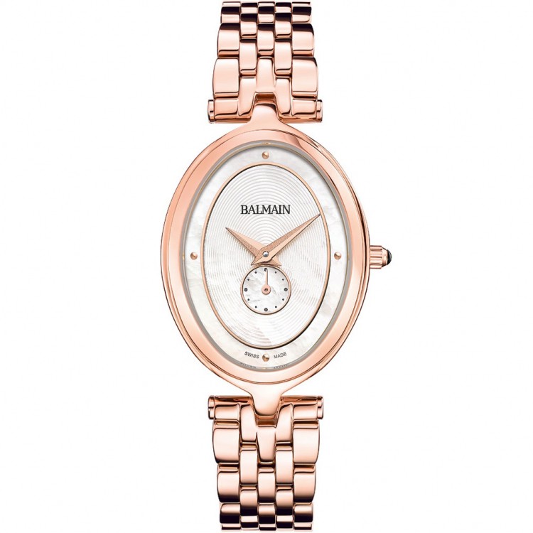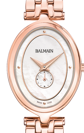 Balmain Quarzuhr, Kollektion Haute Elegance Oval, Gehäuse aus Stahl mit rosafarbener PVD-Beschichtung, Perlmuttzifferblatt, Saphirglas, Armband aus Stahl mit rosafarbener PVD-Beschichtung.