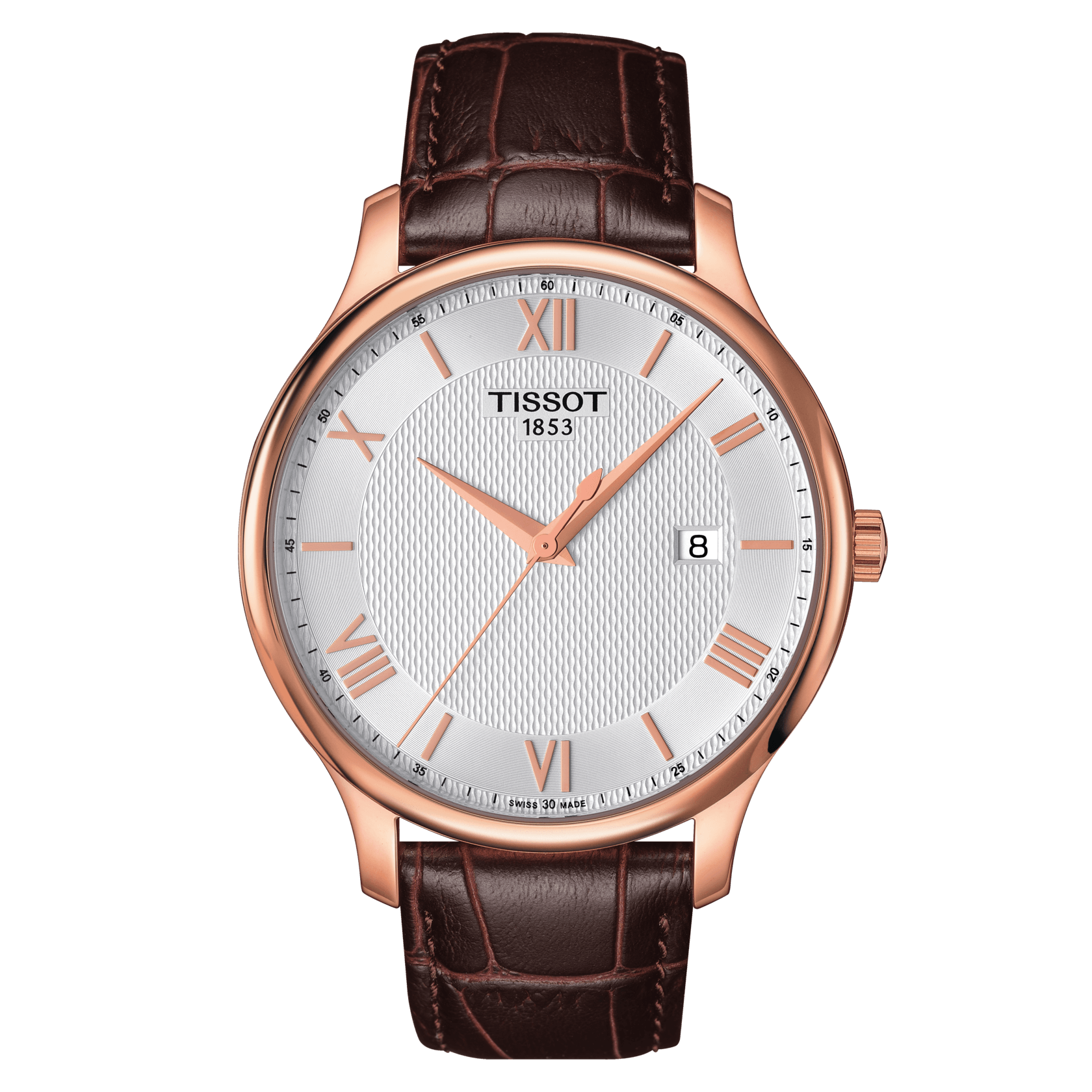 Die Tissot Tradition bleibt mit ihrem klassischen Vintage-Look ihrem Erbe treu und ist deshalb ein wahres Muss für Uhrenliebhaber. Ihr unwiderstehlicher und zeitloser Vintage-Stil mit dem Guilloche-Dekor und dem geschwungenen 316L - Edelstahlgehäuse im Stil der 1950er Jahre mit roségoldfarbener PVD-Beschichtung betonen ihre Attraktivität. Das Swiss Made Quartzwerk mit Batterie-Endanzeige dieses klassischen Modells der Tissot Tradition wird von einem gewölbten, kratzfesten Saphirglas geschützt und verfügt über eine Datumsanzeige, welche der Uhr zusätzlichen Reiz verleiht. Diese Uhr aus der Tissot Tradition Serie hat ein braunes Lederarmband mit Butterfly-Faltschließe und ein silberfarbenes Zifferblatt mit römischen Ziffern und Indizes.