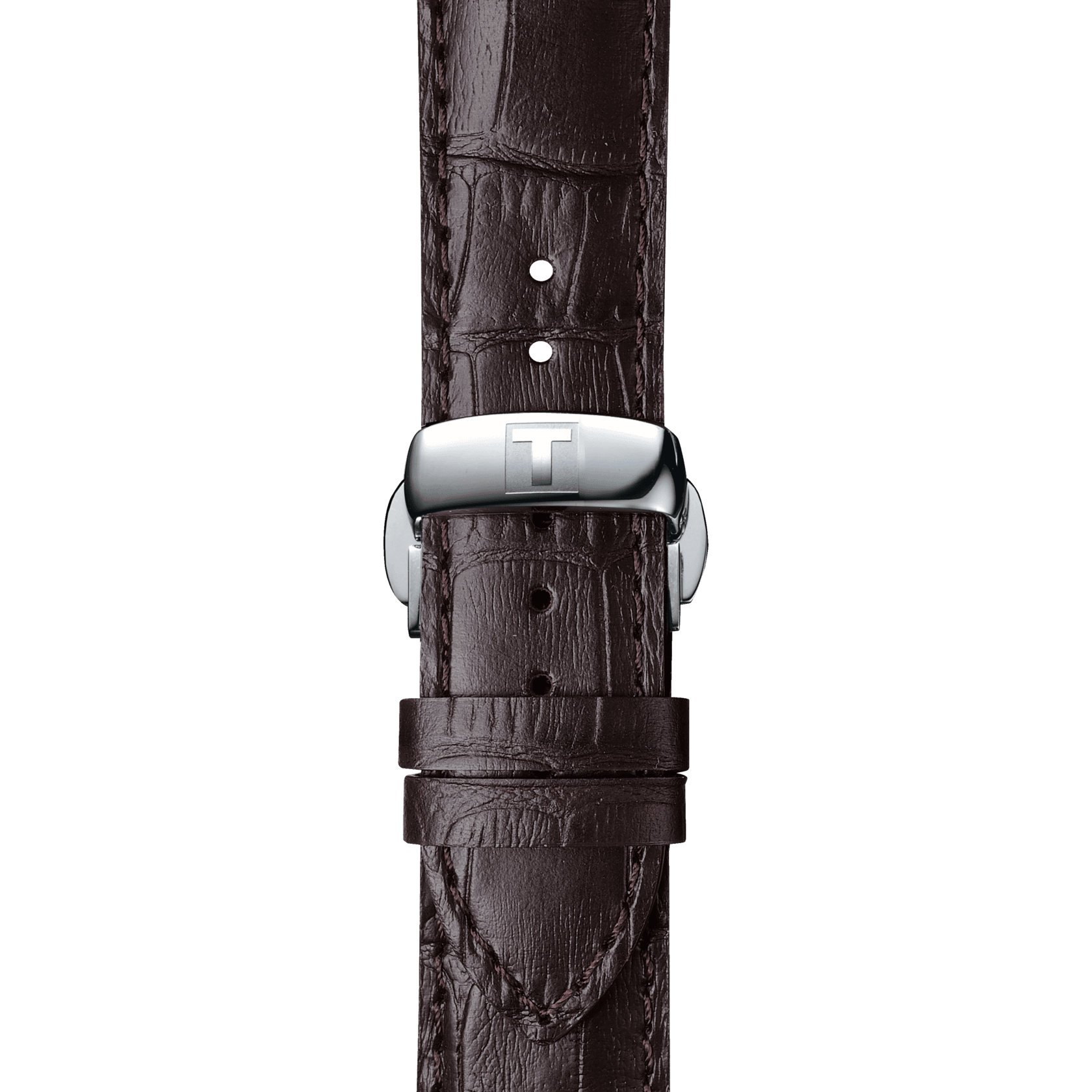 Bei der Tissot Bridgeport Kollektion trifft edles Design auf traditionelle Uhrmacherkunst. Dieses klassische Herrenmodell ist mit einem Swiss Made Quartzwerk mit End-of-Life Anzeige ausgerüstet. Das kratzfeste Saphirglas schützt das silberfarbene Zifferblatt mit Indizes und römischen Ziffern sowie einer Datumsanzeige. Das 316L - Edelstahlgehäuse ist bei dieser Uhr mit einem schwarzen Lederarmband mit Butterfly-Faltschließe und Drückern kombiniert.