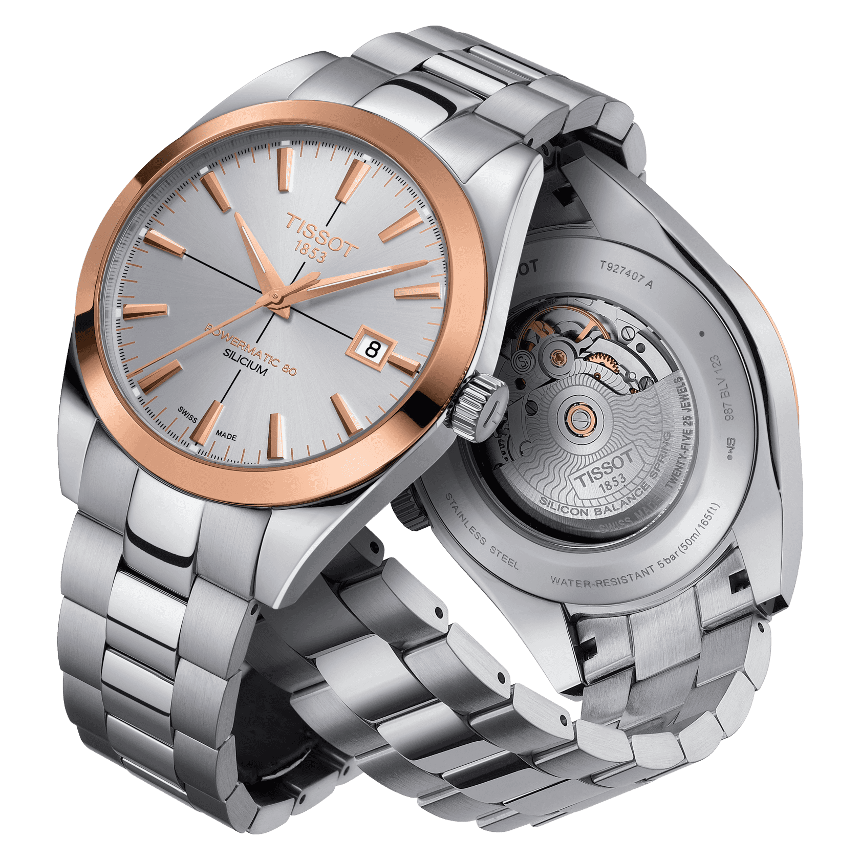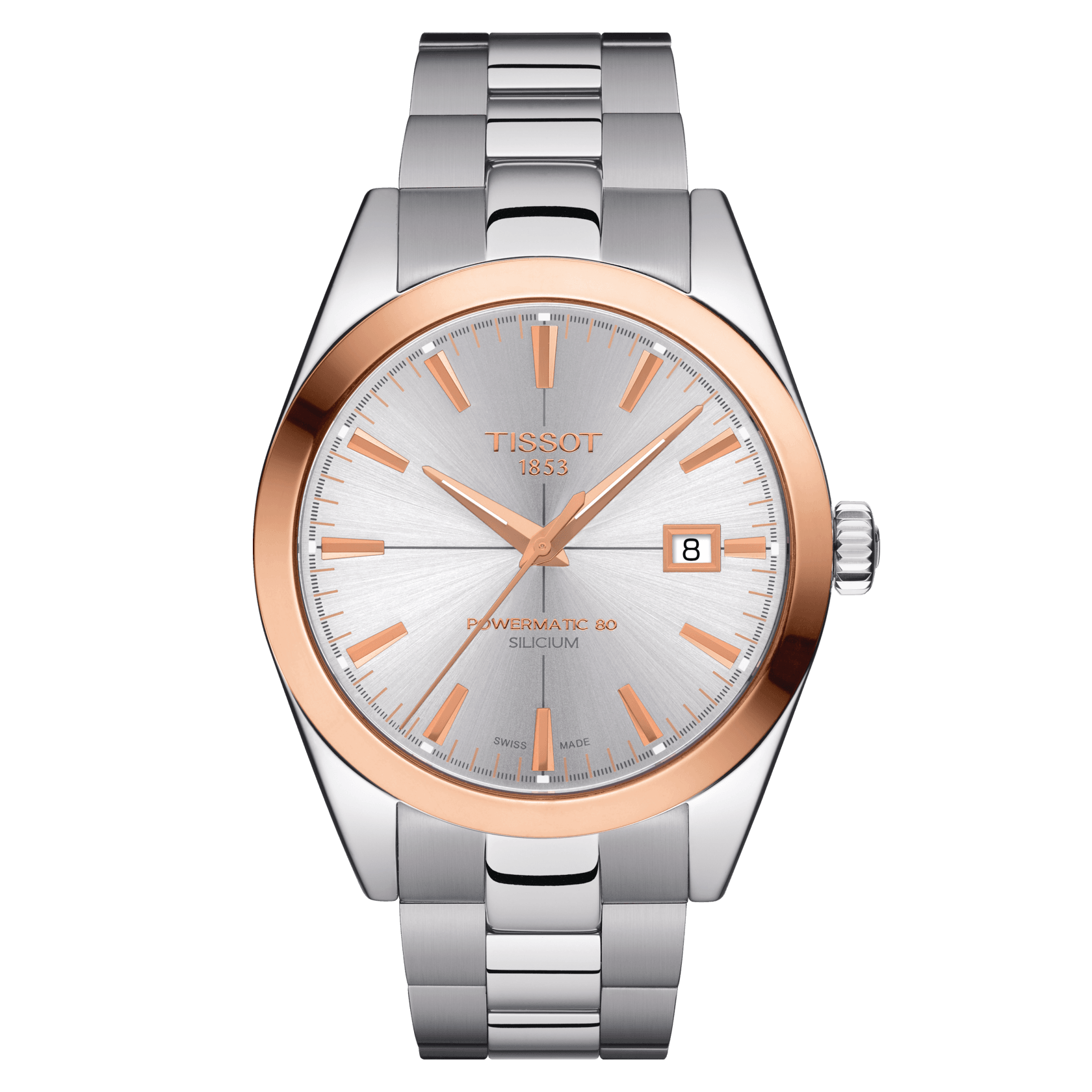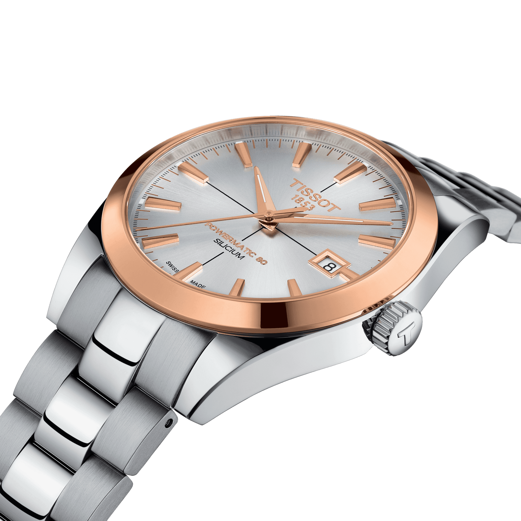 Zu einem Gentleman gehört auch ein stilvoller, klassischer und eleganter Zeitmesser. So wie die neue Tissot Gentleman Automatic, die ihre Klasse bereits im Namen trägt. Auf dem 40 Millimeter messenden 316L-Edelstahlgehäuse sitzend, verleiht die 18 Karat Roségoldlünette der Uhr eine edle Optik und bildet gemeinsam mit den gleichfarbigen Indexen und Zeigern einen gelungenen Kontrast zum Zifferblatt in vier Farbvarianten: von silber- über cremefarben bis hin zu Schokoladenbraun und Schwarz. Passende Armbänder aus Edelstahl oder Leder mit Kontrastnähten komplettieren den Look. Gentleman-like präsentiert sich auch das Innere der Uhr, zu bestaunen durch den gläsernen Sichtboden aus Mineralglas: Das Powermatic 80 Automatikwerk – hier in der Ausführung mit Siliziumspirale (ETA C07.811) – bildet das Herz dieses Zeitmessers und sorgt für bis zu 80 Stunden Gangreserve und konstante Präzision. Dieses Modell hat ein silberfarbes Zifferblatt mit Indizes und Dat