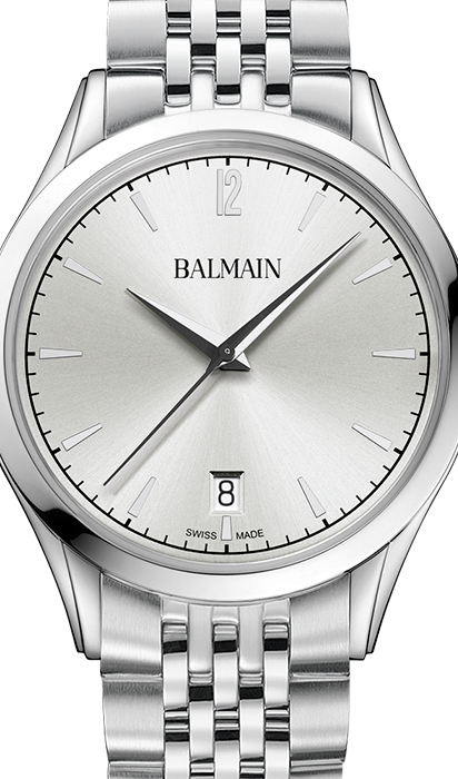 Balmain Quarzuhr, Kollektion Classic R, Stahlgehäuse, silbernes Zifferblatt, Datum, Saphirglas, Stahlarmband.