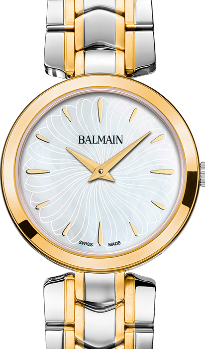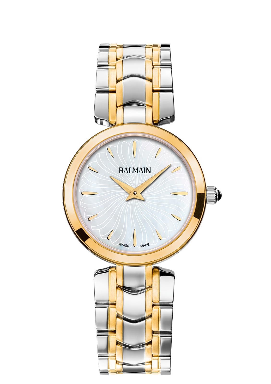Balmain Quarzuhr, Kollektion Madrigal, Stahlgehäuse mit gelber PVD-Beschichtung, Perlmuttzifferblatt, Saphirglas, Stahlarmband mit gelber PVD-Beschichtung.