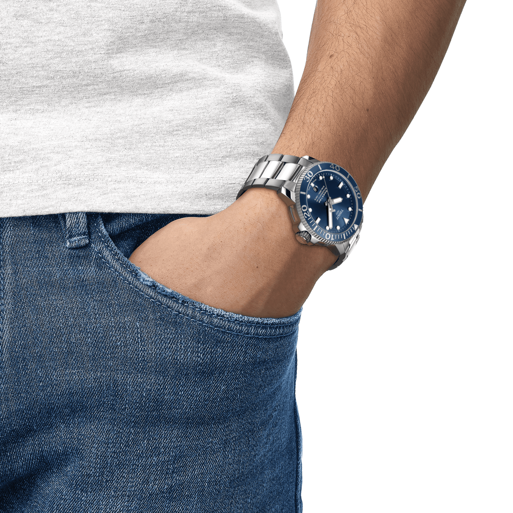 Die Tissot Seastar 1000 Automatic Uhr ist die perfekte Wahl für Taucher. Sie besticht durch ihre hohe Leistung bis zu einem Druck von 30 bar (300 m), ihre Leuchtzeiger und -indizes sowie ihre einseitig drehbare blaue Keramik-Taucherlünette. Mit dieser Uhr können Sie sich in die Tiefe wagen, sie lässt Sie nicht im Stich. Diese Uhr aus der Seastar 1000 Automatic Kollektion ist mit einem Swiss-made Powermatic 80 Uhrwerk, kratzfestem Saphirglas, 316L Edelstahlgehäuse, verschraubter Krone und Boden ausgestattet. Dieses Modell hat ein 316L Edelstahlarmband mit Faltschließe und Sicherheitsschließe. Das blaue Zifferblatt hat Indizes. Außerdem verfügt die Uhr über eine Datumsanzeige und einen transparenten Gehäuseboden.