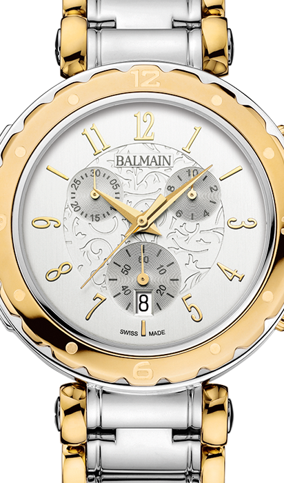 Balmain, Balmainia Chrono Quartz Lady, Stahlgehäuse mit gelber PVD-Beschichtung, silberfarbenes Zifferblatt mit Arabesken, Saphirglas, Stahlarmband mit gelber PVD-Beschichtung, Datum.