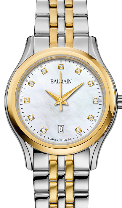 Balmain-Quarzuhr, Beleganza-Kollektion, zweifarbiges Stahlgehäuse mit gelber PVD-Beschichtung, Perlmuttzifferblatt mit 11 Diamanten, Saphirglas, zweifarbiges Stahlarmband mit gelber PVD-Beschichtung.