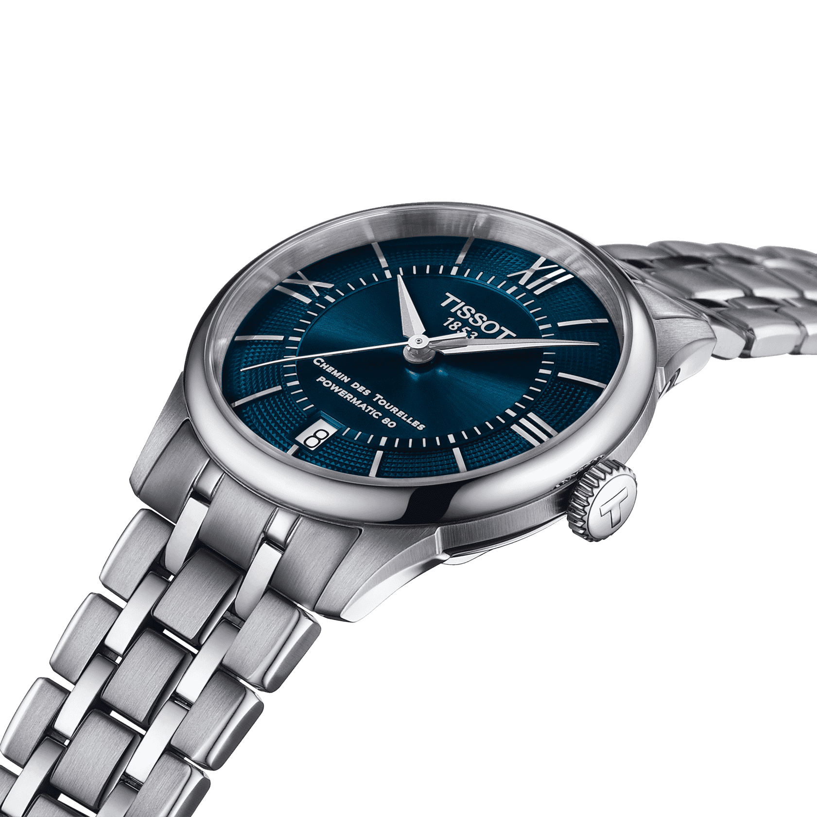 Was steckt in einem Namen? Der Chemin des Tourelles ist nach der Straße benannt, die zum Tissot-Haus in den Schweizer Bergen führt, wo wir seit 1853 wunderschöne Uhren herstellen. Sie ist unsere Ikone, eine ultra-sophistische Armbanduhr. Beachten Sie das runde, glatte Gehäuse und das leicht gewölbte Saphirglas - beides Symbole zeitloser Modernität. Das Zifferblatt ist ebenso raffiniert, mit seinem sanften Sonnenschliff und den facettierten römischen Ziffern, die das Licht auf die richtige Weise einfangen. Und wie sieht es im Inneren aus? Das Nivachron Powermatic 80, ein mechanisches Uhrwerk mit Automatikaufzug, das 80 Stunden Gangautonomie und einen widerstandsfähigen Magnetismus bietet.