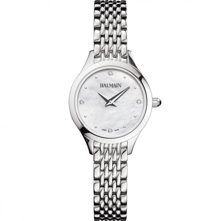 Balmain Quarzuhr, Balmain de Balmain Kollektion, Stahlgehäuse, 25 mm, Perlmuttzifferblatt, Saphirglas, Stahlarmband. Zifferblatt besetzt mit 4 Diamanten Top Wesselton VS-SI, insgesamt 0,015 Karat.