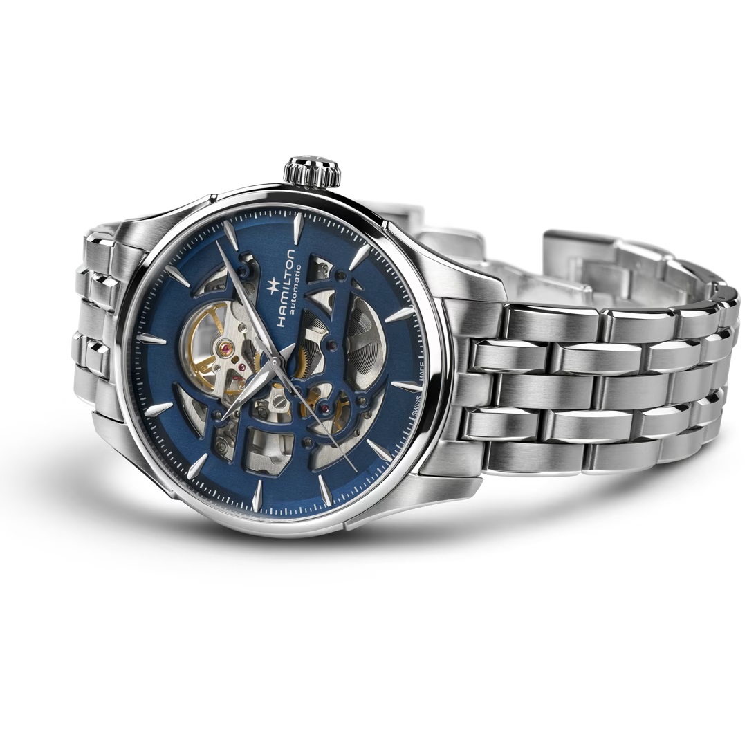 Präzision ist das Schlüsselwort der Jazzmaster Skeleton 40 mm, die mit einem blauen, durchbrochenen Zifferblatt versehen ist, das die subtile Schönheit ihrer inneren Mechanismen enthüllt. Angetrieben von einem Automatikwerk H-10-S mit 80 Stunden Gangreserve und einer Spiralfeder aus Nivachron™, ist die Jazzmaster Skeleton an einem raffinierten Armband aus Edelstahl befestigt, das die von Hamilton geschätzte Liebe zum Detail und das ständige Streben nach Innovation verdeutlicht.