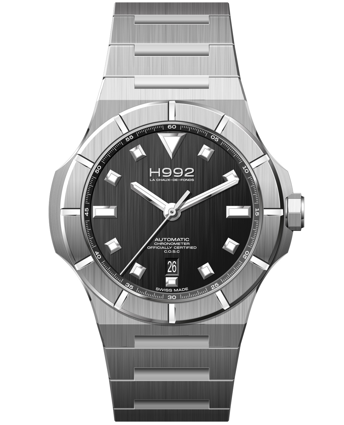 Ich bin die H4 Uhr. Ich bin die natürliche Weiterentwicklung der Marke H992, Ihre Lieblingsuhr in neuem Gewand. Ihr Design wurde bis ins kleinste Detail überarbeitet: ein schlichtes Zifferblatt, ein überarbeitetes Gehäuse, ein austauschbares Armband. Meine Luminova-Zeiger leuchten im Dunkeln und das Gehäuse mit Saphirglas sorgt dafür, dass nichts meinen Glanz trüben kann.