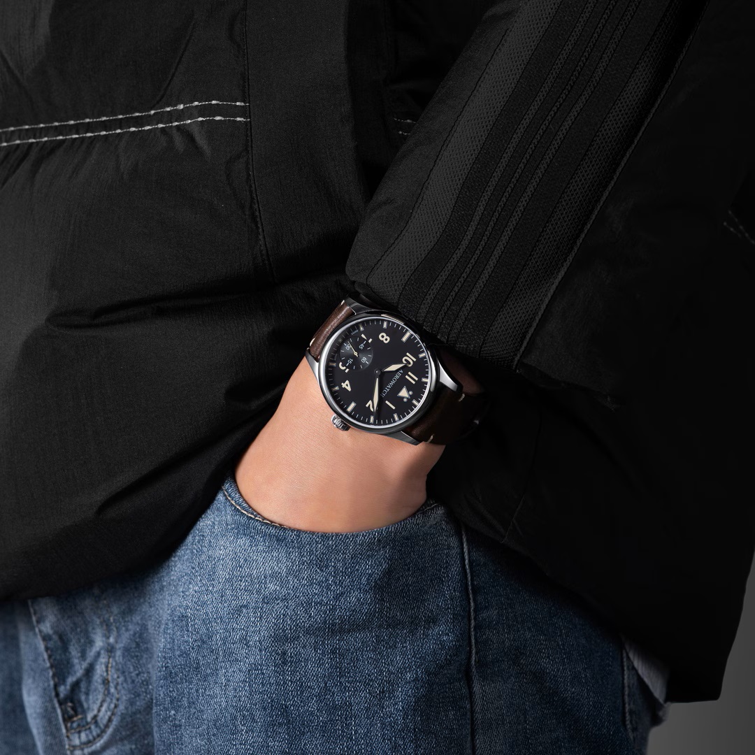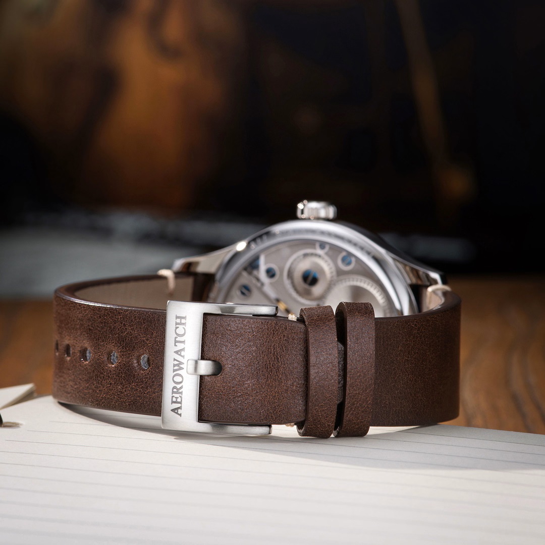 Mit dem Fokus auf die Luftfahrt unterstreicht die Aerowatch Renaissance Big Mechanical Pilot das traditionelle uhrmacherische Können und die Anwendung einer der raffiniertesten Techniken. Das mechanische Uhrwerk mit Handaufzug verlangt von den Handwerkern ein Höchstmaß an Präzision und Geschicklichkeit. Das runde 43 mm Stahlgehäuse der Renaissance Big Mechanical Pilot mit seinen ausgewogenen Proportionen fällt an jedem Handgelenk auf. Große Leuchtziffern und -zeiger verleihen ihm seine unverwechselbare Identität. Die Anzeige der kleinen Sekunde ist perfekt in die Gesamtästhetik der Uhr integriert. Mit einer solchen Uhr am Handgelenk haben Sie immer die Zeit zur Verfügung. Die Uhr ist mit dem hochwertigen Swiss Made Handaufzugskaliber ETA Unitas 6498-1 ausgestattet, das eine Gangreserve von 52 Stunden bietet.