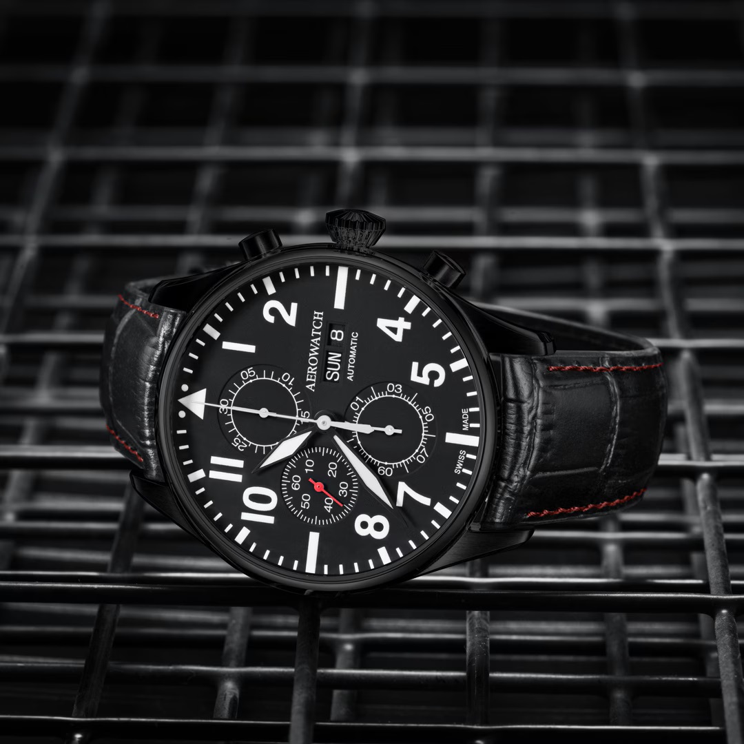 Aerowatch Les Grandes Classiques Chrono Pilot Auto schwarz 44mm
