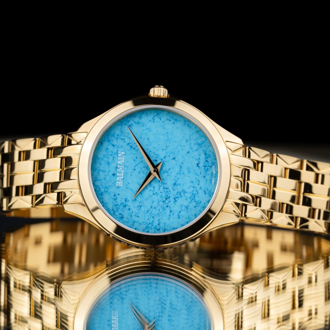 Balmain bietet neue Varianten seiner Flamea-Kollektion an. Diese Stücke, die zum Trendies-Segment gehören und direkt vom Geist der Haute Couture beseelt sind, tragen stolz Zifferblätter aus Naturstein, eine Besonderheit, die den Ruf der Marke seit ihren Anfängen begründet hat. Die Flamea-Kollektion ist schlicht und schick zugleich und repräsentiert die zeitgenössische Vision der Balmain-Eleganz. Inspiriert von der faszinierenden Welt der Haute Couture, wo der Fantasie keine Grenzen gesetzt sind und wo die originellsten Kreationen erlaubt sind, immer zu Ehren der französischen Eleganz und Raffinesse.