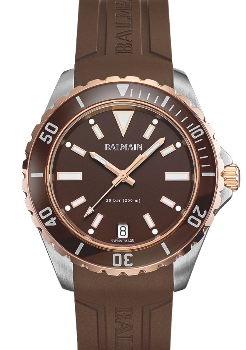 Die Balmain Ophrys ist eine kunstvolle Herrenuhr, die einen hellen Stil mit einem modernen, von der Pariser Haute Couture inspirierten Design verbindet. modernen, von der Pariser Haute Couture inspirierten Design verbindet. Das schokoladenbraune Zifferblatt und die Lünette und die Lünette mit minimalen Linien sorgen für einen ausdrucksstarken Touch, während das zweifarbige 42,50 mm PVD Gehäuse aus Edelstahl und Roségold PVD mit einem raffinierten 10,00 mm Profil und einem schokoladenbraunen Kautschukarmband für die Raffinesse des Alltags sorgt. schokoladenbraunes Kautschukarmband für die Raffinesse des Alltags sorgt. Dieser Swiss Made Zeitmesser ist mit einem Saphirglas ausgestattet.