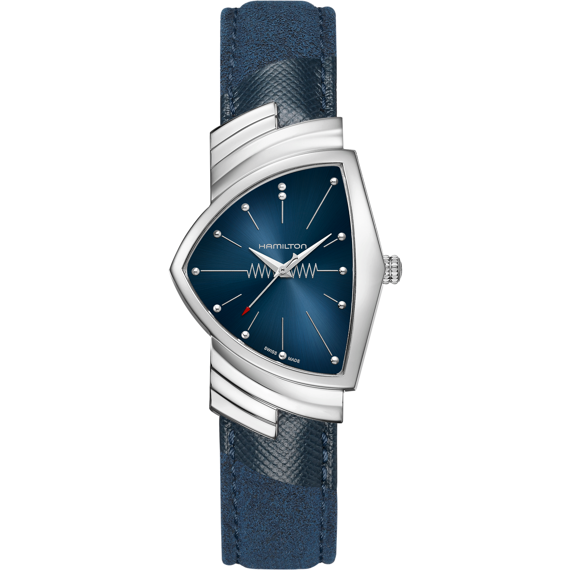 1957 brachte Hamilton die erste elektrische Uhr, die Ventura, auf den Markt. Diese revolutionäre Uhr markiert den Beginn einer neuen Ära in der Welt der Uhrmacherei und ist ein Emblem für futuristisches Design und ein Symbol für Innovation. Inspiriert von Elvis Presleys Hit Blue Suede Shoes ist die Ventura Quartz mit vernickelten Stunden-, Minuten- und Sekundenzeigern sowie einem zuverlässigen Quarzwerk ausgestattet, das in einem emblematischen dreieckigen Edelstahlgehäuse untergebracht ist. Ein intensiv blaues Alcantara-Armband ergänzt das dunkelblaue Zifferblatt, das an die berühmten Schuhe des King erinnert, von denen in dem Lied die Rede ist.