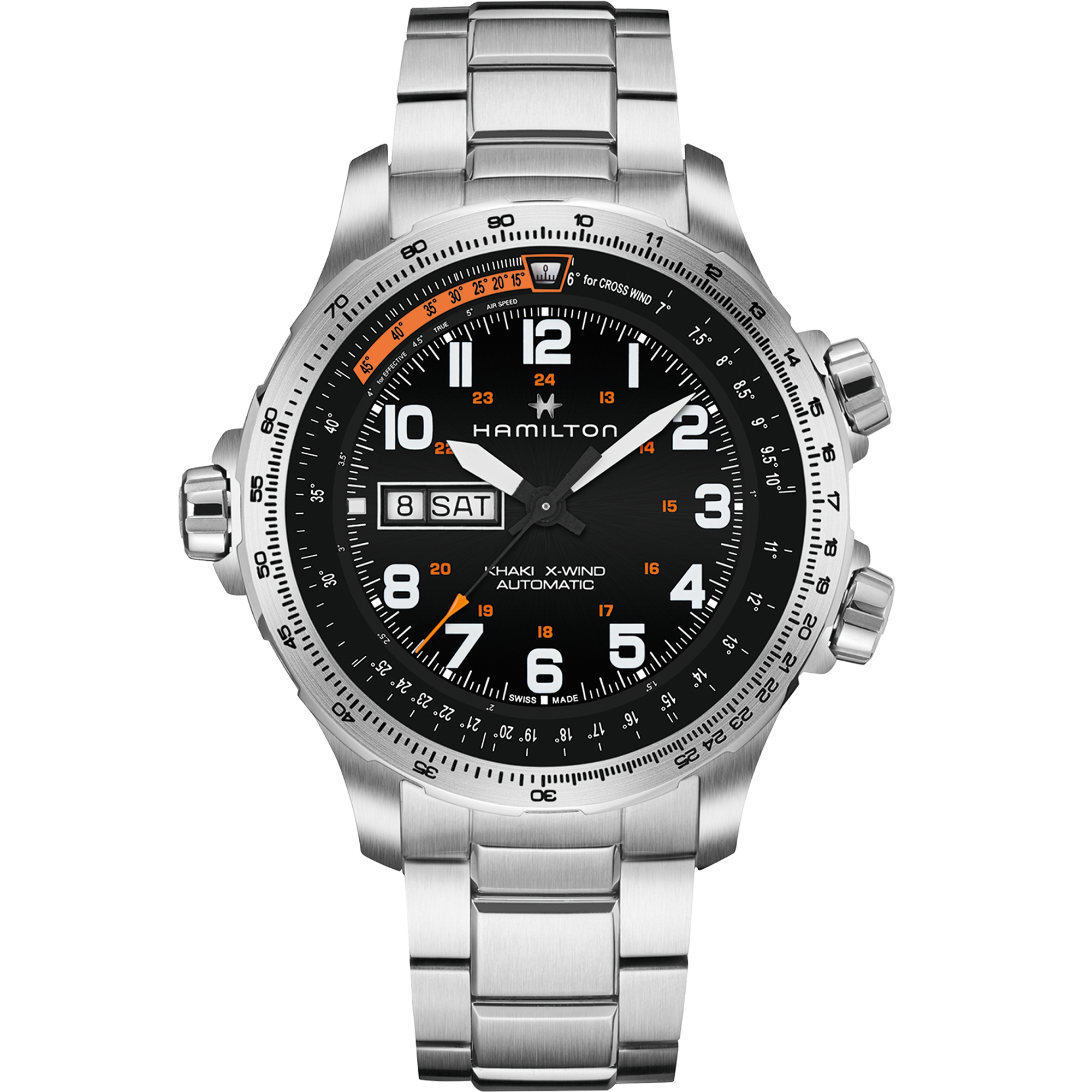 Hamilton fügt der Kollektion Khaki X-Wind eine Day Date Version mit automatischem Aufzug hinzu. Mit großen Super-LumiNova® Ziffern und sportlichen Zeigern bietet sie die außergewöhnliche Ablesbarkeit, die Sie benötigen, wenn Sie nur den Bruchteil einer Sekunde Zeit haben, um auf das Zifferblatt zu schauen. Das Tag-Datum-Fenster bei 9 Uhr trägt zur visuellen Ausgewogenheit des Zifferblatts bei. Perfekt klar und bereit für den Flug.