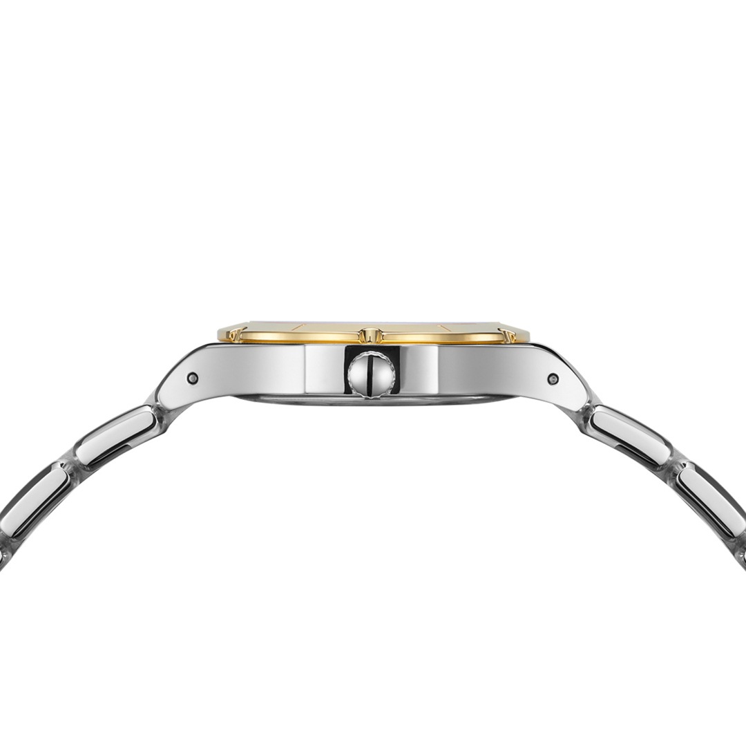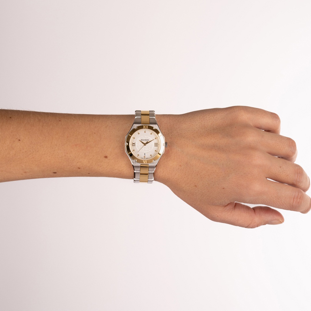 Die Balmain Be Balmain ist eine elegante Damenuhr, die strahlenden Charme mit einem modernen Design verbindet, das von der Pariser Haute Couture inspiriert ist. Das weiße, mit Arabesken verzierte Zifferblatt ist mit 10 Top Wesselton VS-SI Diamanten von insgesamt 0,036 Karat besetzt und verfügt über Diamantziffern. Das 31 mm Gehäuse aus zweifarbigem Edelstahl und Gelbgold PVD, mit einem raffinierten 7,65 mm Profil und einem passenden Armband, bietet einen zeitlosen Stil für den Alltag. Dieser in der Schweiz hergestellte Zeitmesser ist mit einem Saphirglas ausgestattet.
