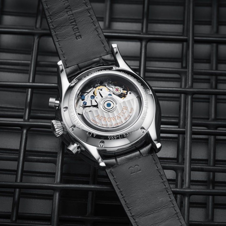 Mit dem Pilot Automatic Chrono lässt Aerowatch den Pioniergeist der Luftfahrt wieder aufleben und stellt gleichzeitig seine uhrmacherischen Fähigkeiten unter Beweis. Inspiriert von den Anfängen der 1910 in La Chaux-de-Fonds gegründeten Marke, vereint dieser charakterstarke Chronograph Funktionalität, Ästhetik und Zuverlässigkeit.
