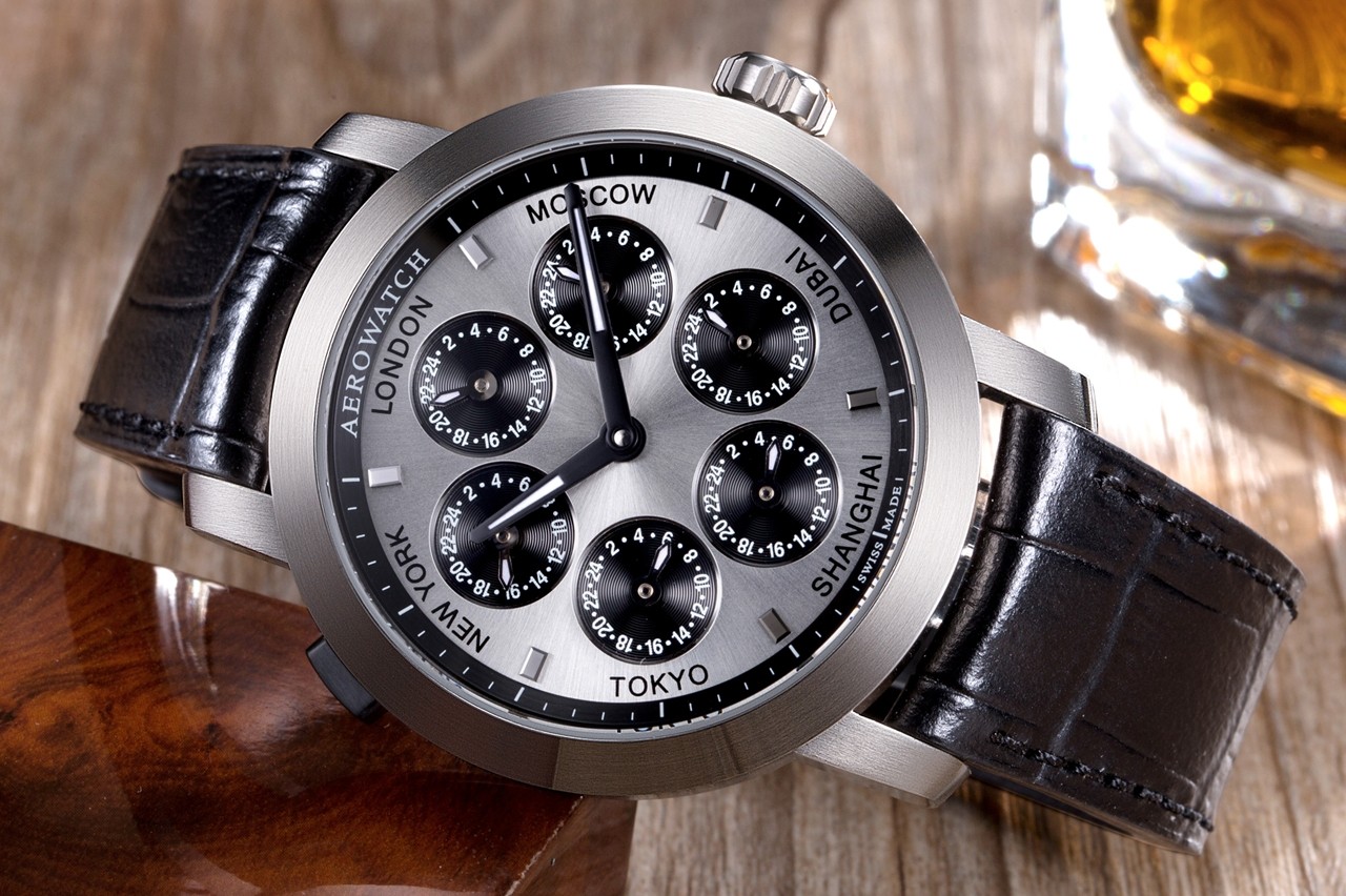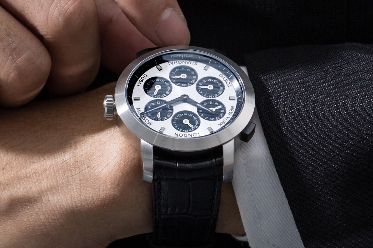 Argenté soleillé, indexes noirs rectangulaires, 6 compteurs noirs (24h), London, Moscow, Dubai, Tokyo, Shanghai, New York.