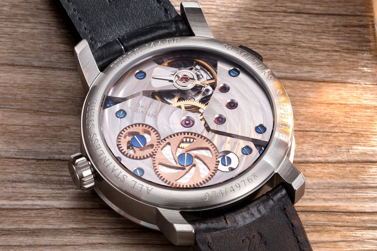 Mécanique 16 1/2 6497-1 ETA, 17 rubis. Propre module développé par Aerowatch, avec affichage de 7 fuseaux horaires. Décors « Côtes de Genève » circulaires rhodiés, perlages et vis bleuies. Rochet et roue de couronne décor « Tourbillon », squelettés et dorés or rose 4N. Heure locale et heure minute avec 6 autres fuseaux horaires (compteurs 24 heures).