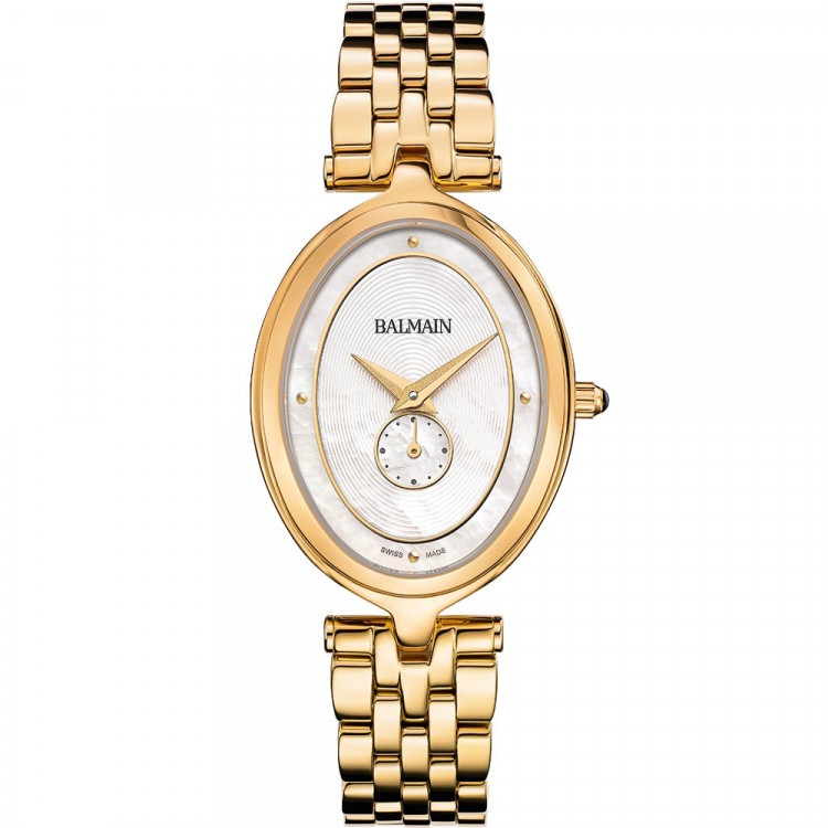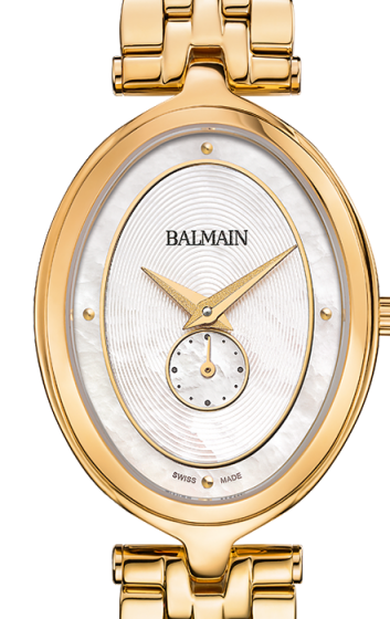 Montre Balmain quartz, collection Haute Elegance Ovale, boîtier acier-PVD jaune, cadran nacre, verre saphir, bracelet acier-PVD jaune.
