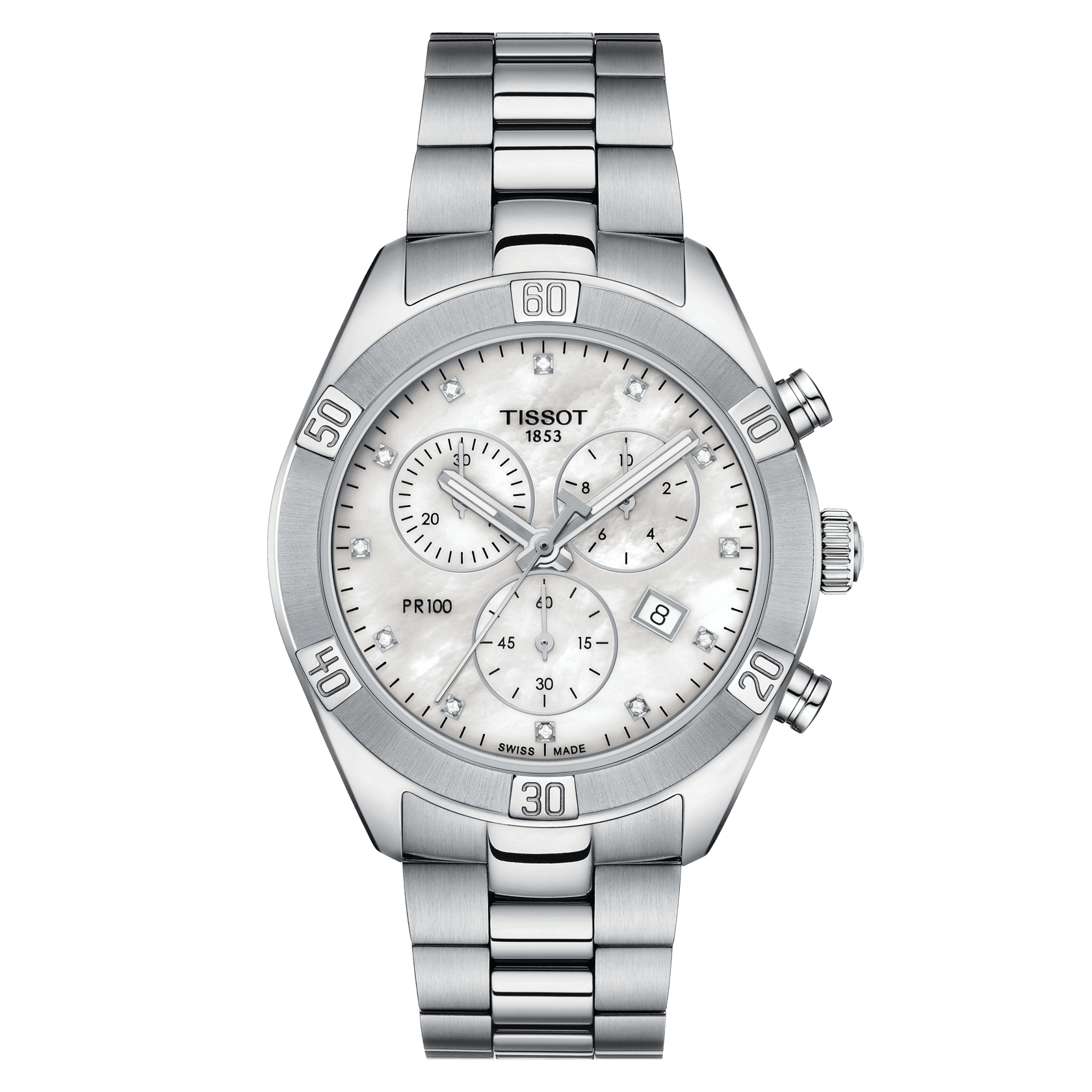 Face au succès de la collection PR 100 Sport-Chic, la série s’enrichit d’un chronographe sportif. Se rendre à la salle de sport directement après la réunion d’affaires ou quitter le bureau sans détour pour aller faire son jogging ? Aucun problème avec les nouvelles montres Tissot PR 100 Sport Chic Chronograph Lady ! Sportives et élégantes, robustes et féminines à la fois, ces montres pour elle se présentent en six versions. Qu’elles soient tout simplement en acier inoxydable, en optique bicolore, avec un cadran en nacre ou en diamants - des composants de haute qualité tels que le verre saphir résistant aux rayures ou le bracelet en acier inoxydable avec boucle déployante et poussoirs ainsi que l’étanchéité à l’eau jusqu’à une pression de 10 bar (100 m) garantissent une parfaite aptitude à l’usage quotidien. Avec son boîtier généreux de 38 mm, elle fait partie des modèles de montres plus grands et assure une déclaration marquante. Le design est à la fois robuste et magnifiquement aérodynamique et se caractérise par des lignes épurées.
