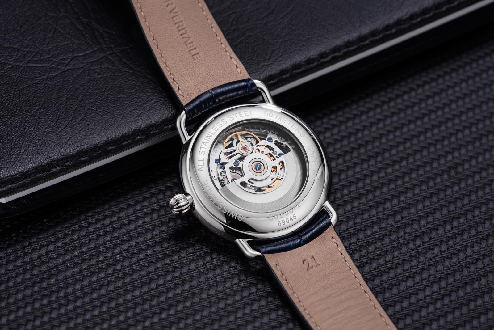 Acier poli, verre saphir, fond transparent