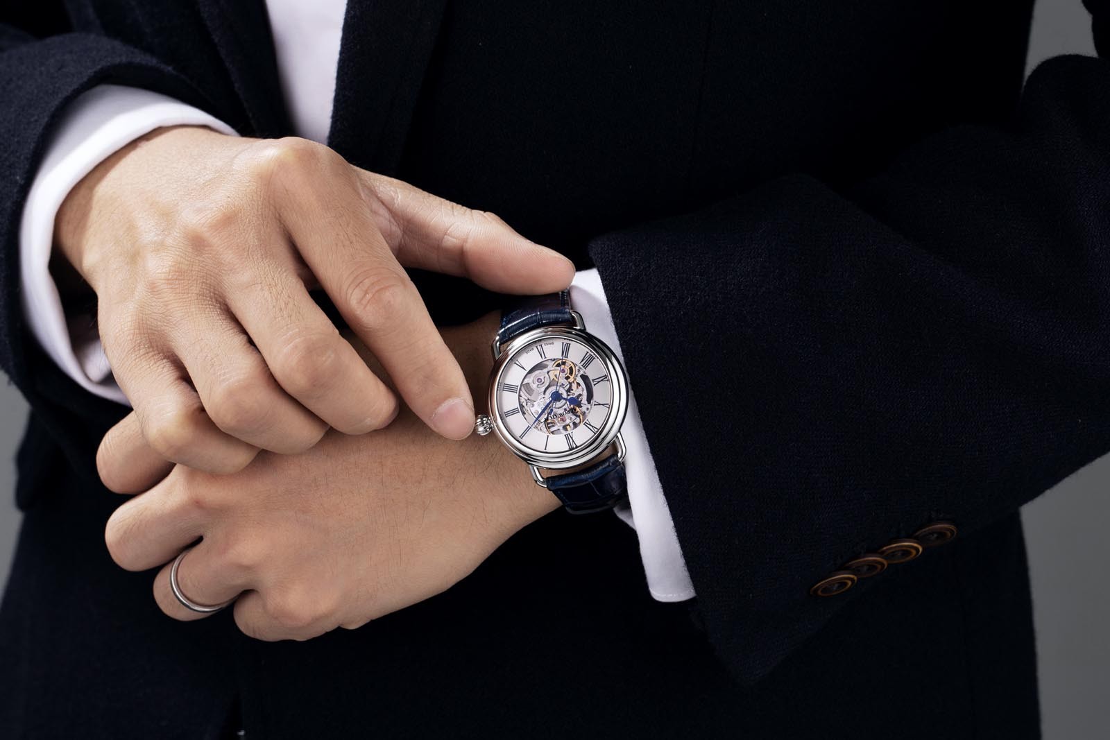 Boîtier Acier poli, verre saphir, fond transparent Cadran Anneau blanc-argenté soleillé, 12 chiffres romains Mouvement Automatique 11 1/2''' Sellita SW200-1,...
